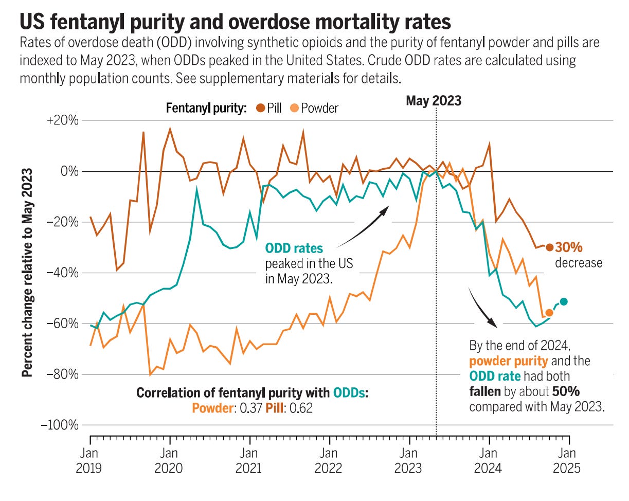 Why did deaths keep dropping? We still don’t know. I wrote last year about the possibility that the drop was driven by a trend away from injecting fentanyl towards smoking fentanyl, others have proposed that the gradual increase in availability of naloxone and buprenorphine has been making an impact, and others suggest the huge overdose surge during covid is just leveling off. An excellent paper in Science last week suggests that a ‘China shock’ of new restrictions on fentanyl precursors caused a drop in the strength of street fentanyl that corresponded closely with the drop in overdose deaths.