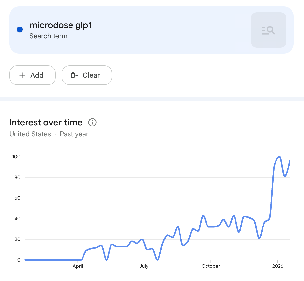 MESSY: Microdosing GLP-1s is certainly growing in popularity (see the google trends chart below) but I think objectively it remains below the level of a ‘large trend’. That said, I think it will continue to grow and there has been a lot of coverage of the concept recently (here’s the Today Show).